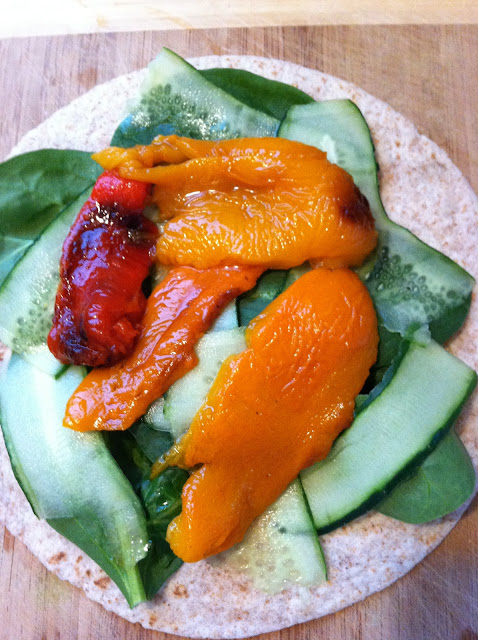 Peppers go with pretty much anything, such as this concoction: whole wheat wrap, spinach, cucumbers (sliced very thin), roasted peppers (of course), a drizzle of EVOO, spices to taste (cumin, pepper, onion powder, garlic powder), and some cheddar cheese.